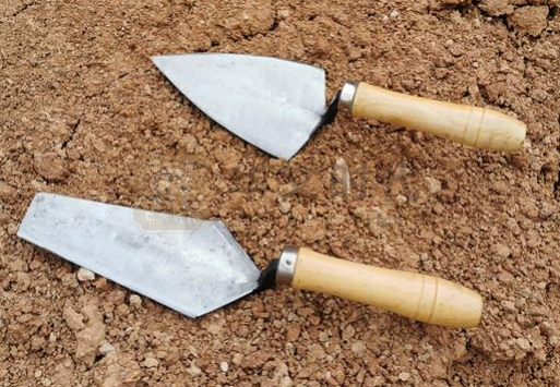 在田野考古工作中,手铲作为基础且必不可少的工具,贯穿于发掘全过程。我们工地上所使用的手铲统一采用平头造型与木制手柄,兼顾耐用性与操作灵活性。其中一款在右侧特别设计了隆起结构,便于前握时更为省力,备受大家欢迎。不少同学还特意在工具上刻下专属标识,以区分彼此的手铲。